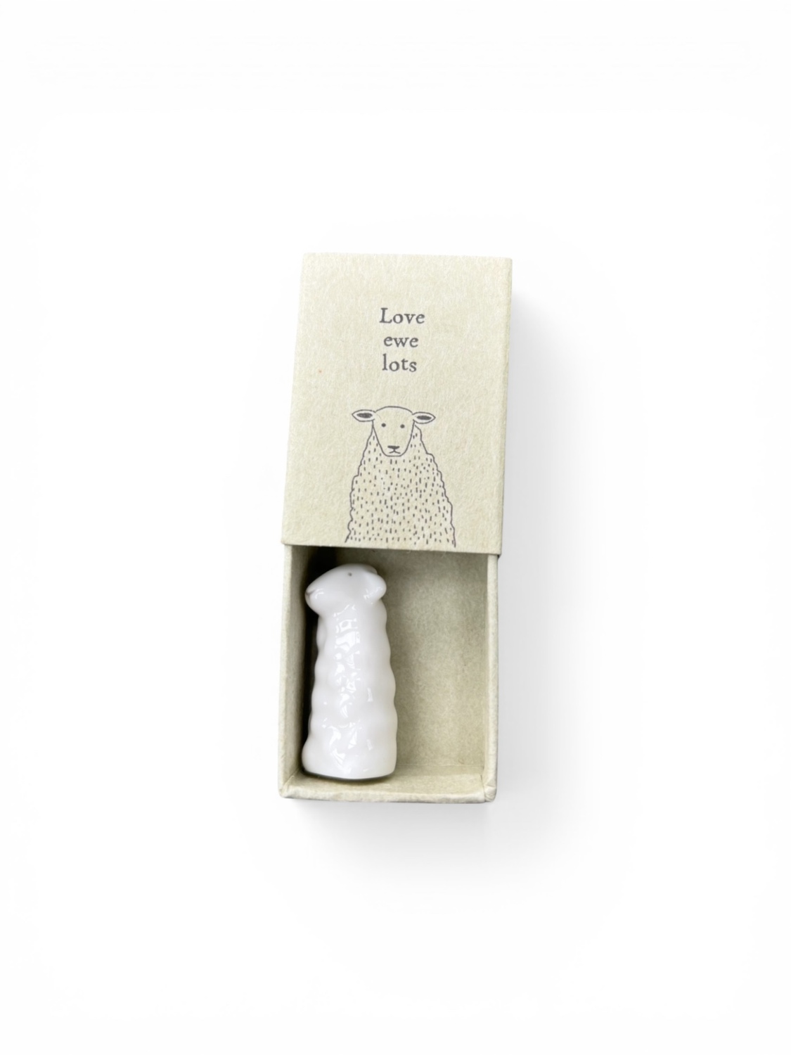 A stunning matchbox made with recycled Kraft paper with the message ” love ewe lots” printed on the outside with a stunning white porcelain sheep inside.