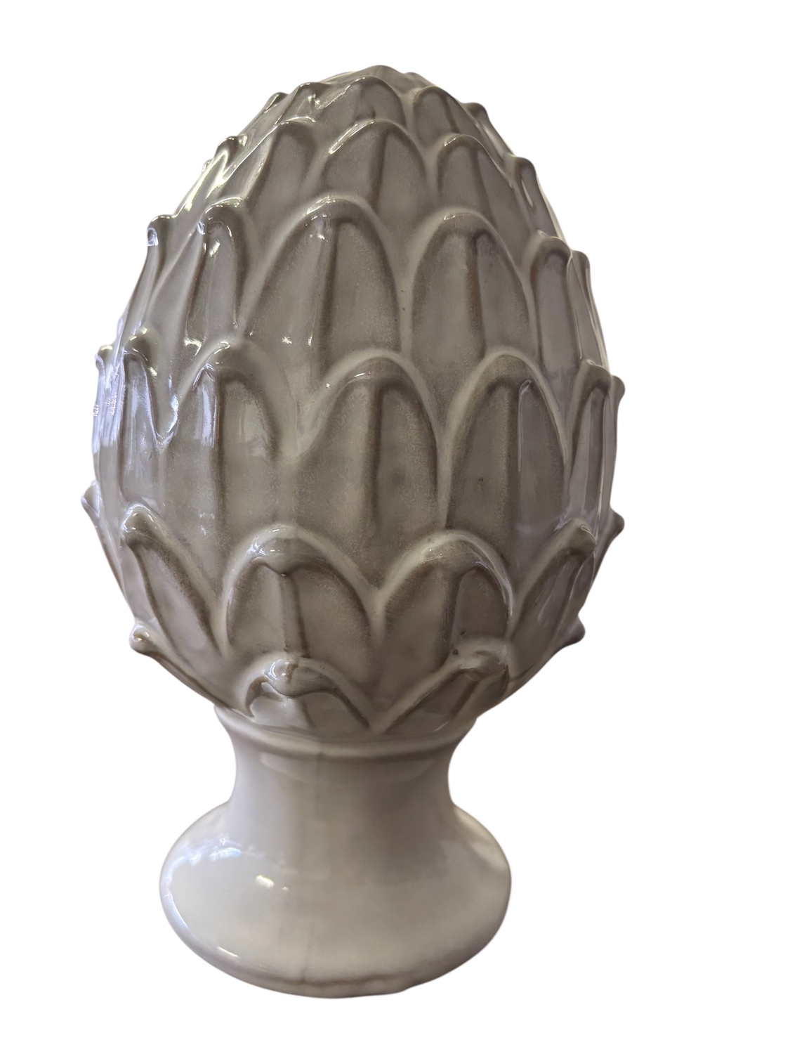 A stunning glazed ceramic Artichoke in a white shade with tips of taupe available in 3 sizes. They would look stunning on a coffee table, side table or book shelves.