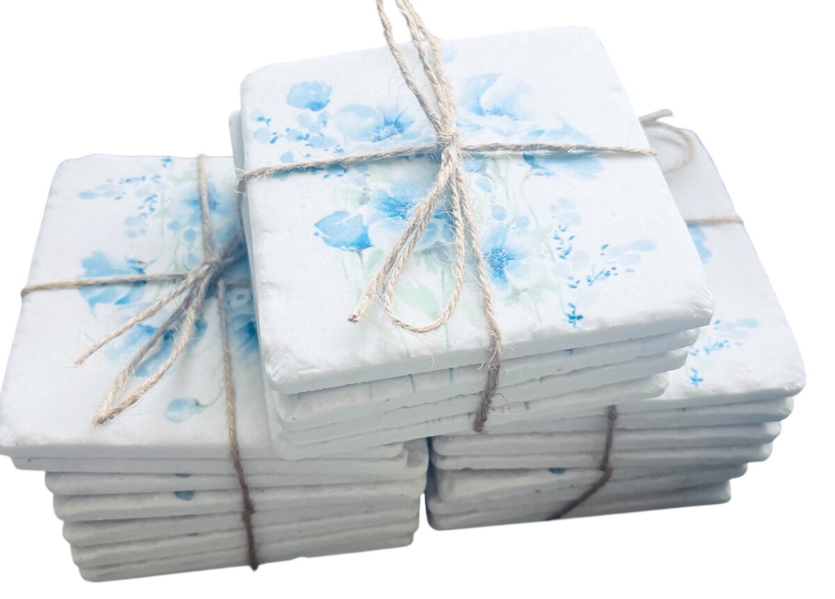 A stunning 4 pack of blue poppies coasters cork backed resin coasters, with 2 different designs. They are so beautiful and make a fabulous gift or an addition to anybody’s home or patio table.